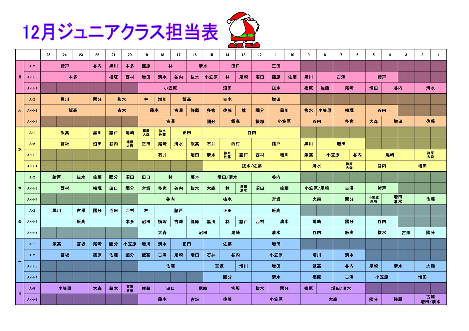 12月度 ジュニアクラス担当表
