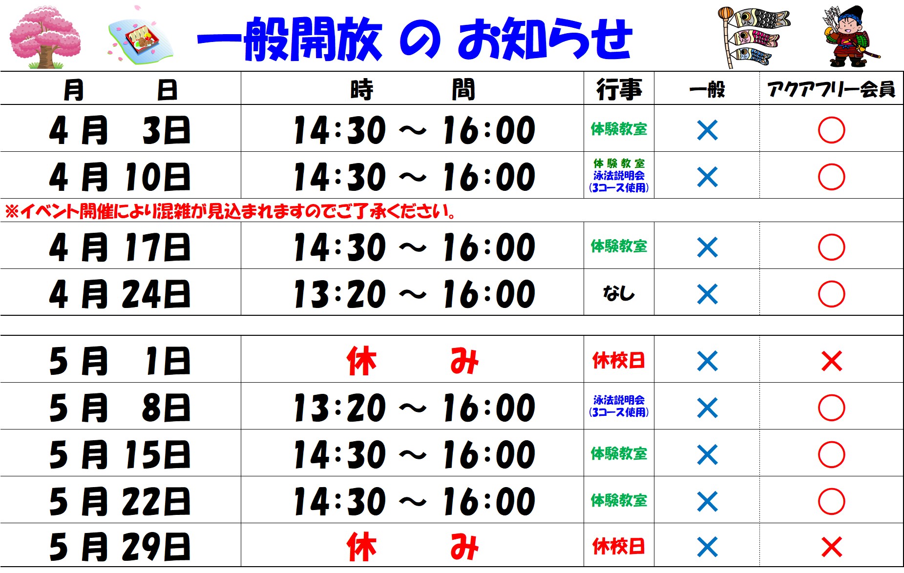4月・5月★アクアフリーならびに一般開放のお知らせ★