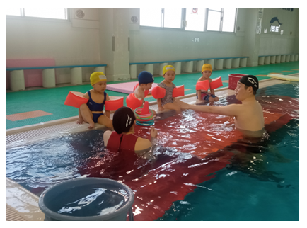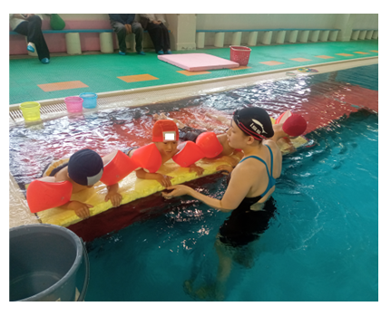 ジュニアクラス(4歳~小学生)では、お水に顔をつける練習をしたり、みんなで手をつないで浮いてみたり