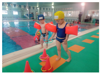 幼児クラス(2歳6ヵ月~4歳6ヵ月)では、先生やお友達と一緒に、わなげや滑り台などを使って、遊びながら楽しく水慣れをおこないました☆