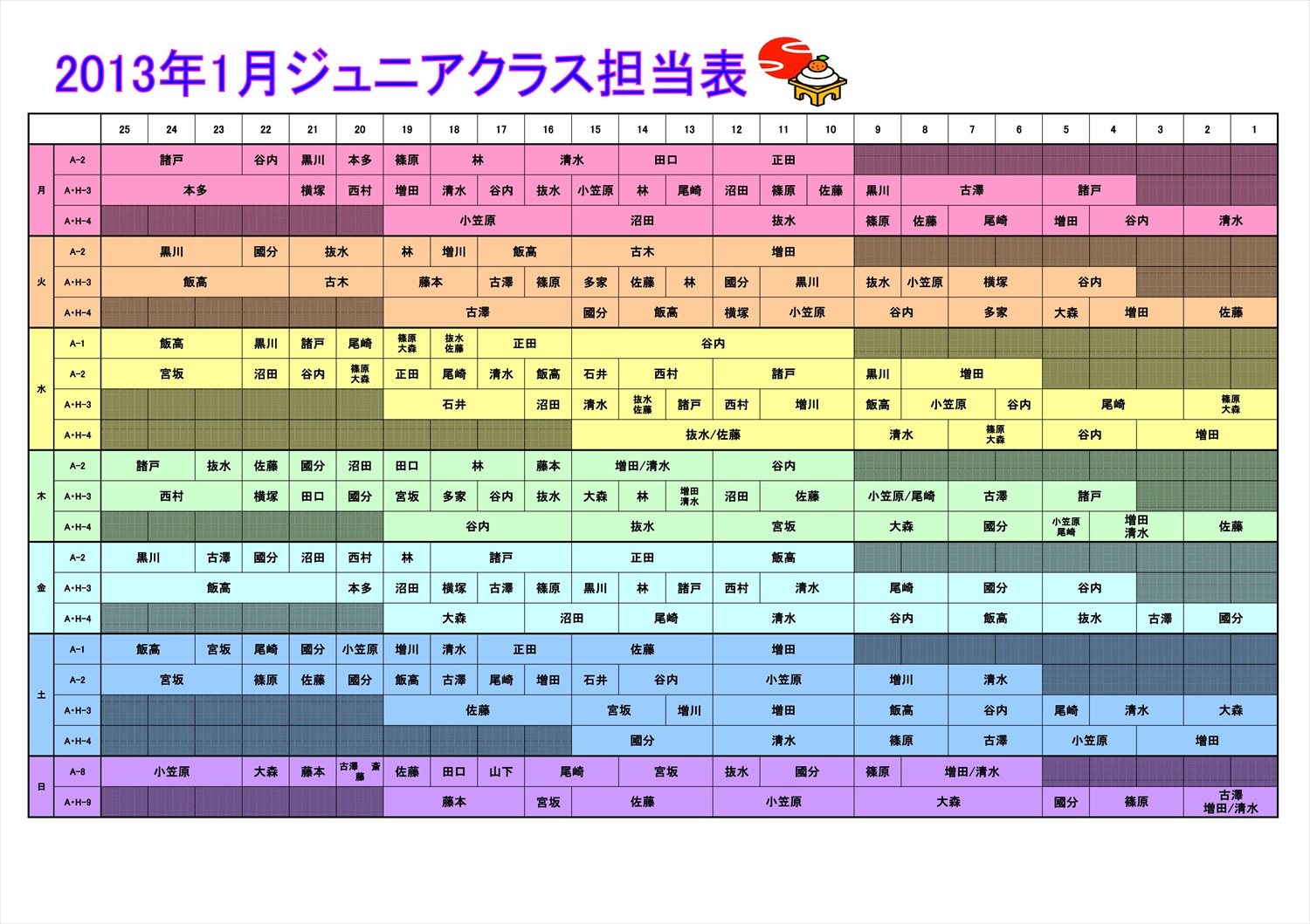 1月度 ジュニアクラス担当表