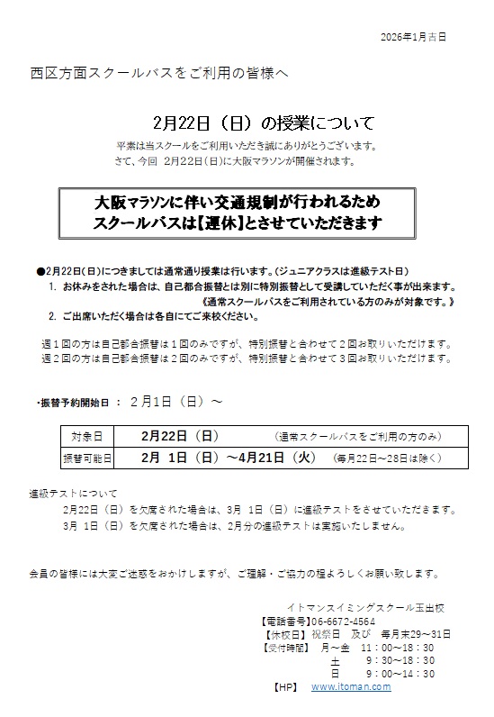 2月22日(日)に大阪マラソン開催により西区方面のスクールバスは運休となります。