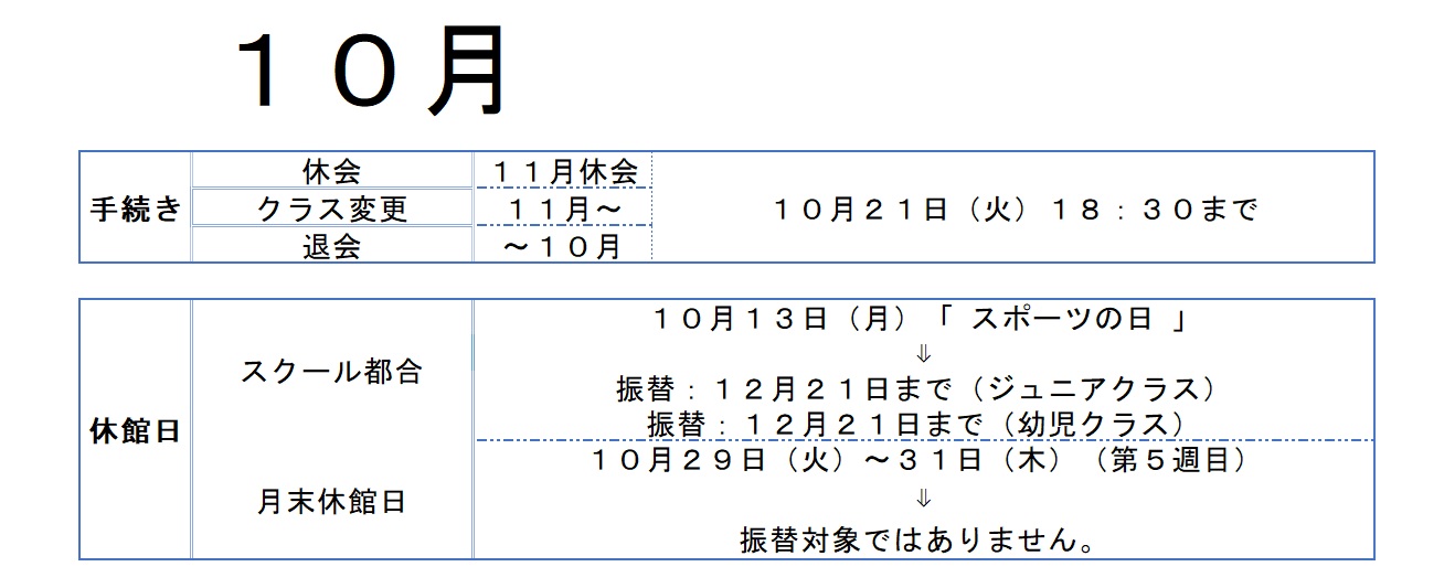 <10月> 手続き・休館日 お知らせ