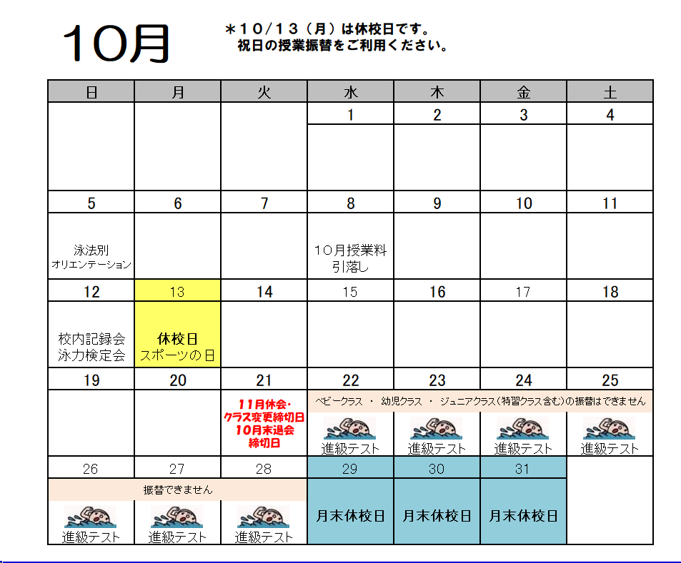 クラス変更 前月21日まで 例)11月から変更したい → 10月21日締切り