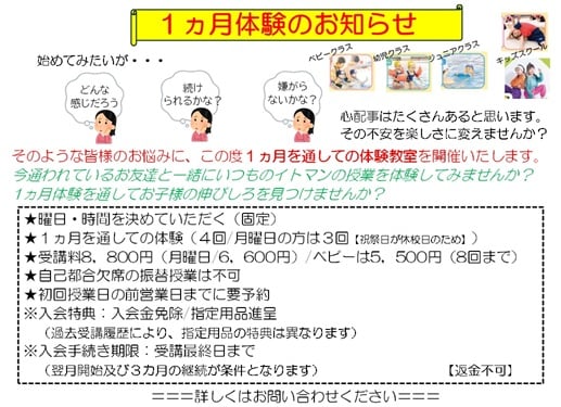 そのような方々のために『1ヵ月体験教室』を開催いたします。