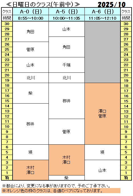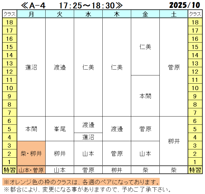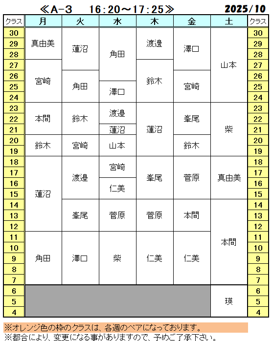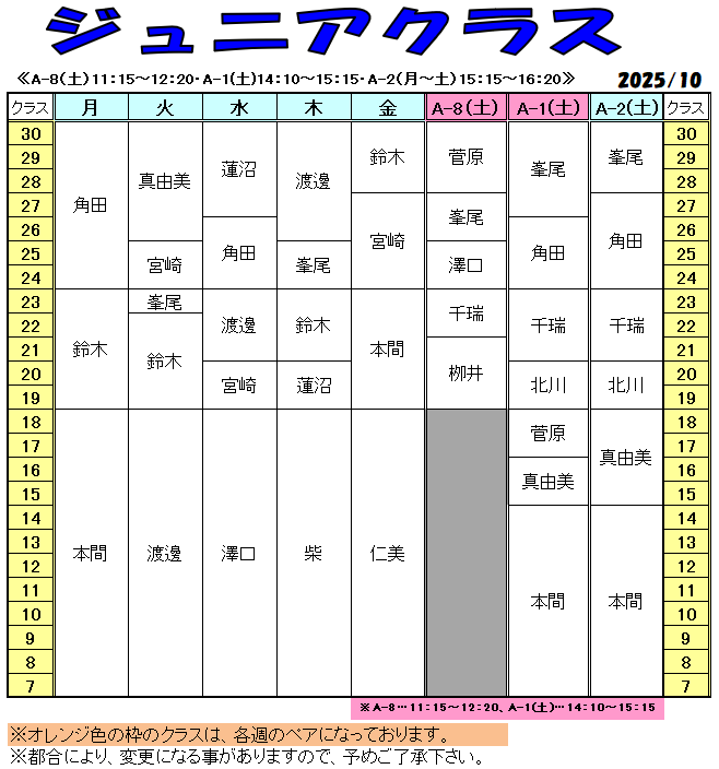 《2025年10月ジュニア・特習クラス担当表》
