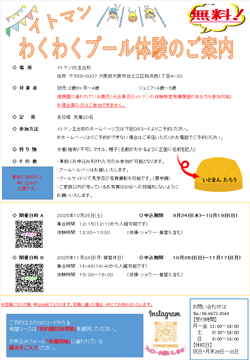 10月25日(土)と11月24日(月・休日振替)にわくわくプール体験を行います☆