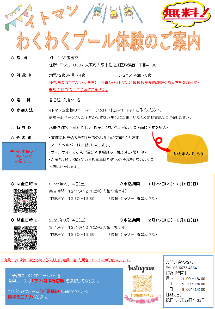 2月14日(土)と3月14日(土)にわくわくプール体験を行います☆
