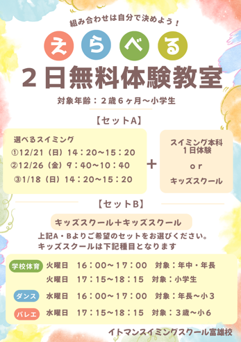スイミング1日体験の日程はタイムテーブルをご確認ください。