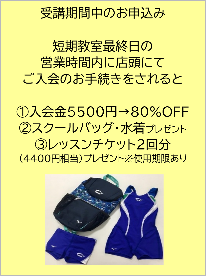 ※短期教室は指定教材として水泳帽(481円)、出席カードケース(103円)、
