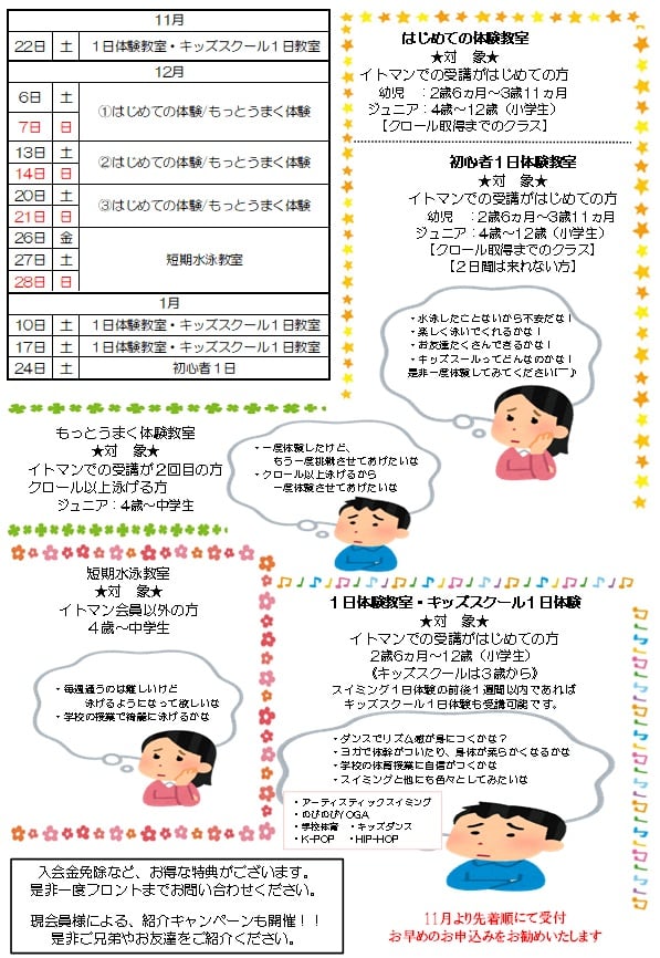 1日では不安なので、2日間体験してみたいという方に人気のクラスです。 🏊こちら(11月公開予定)