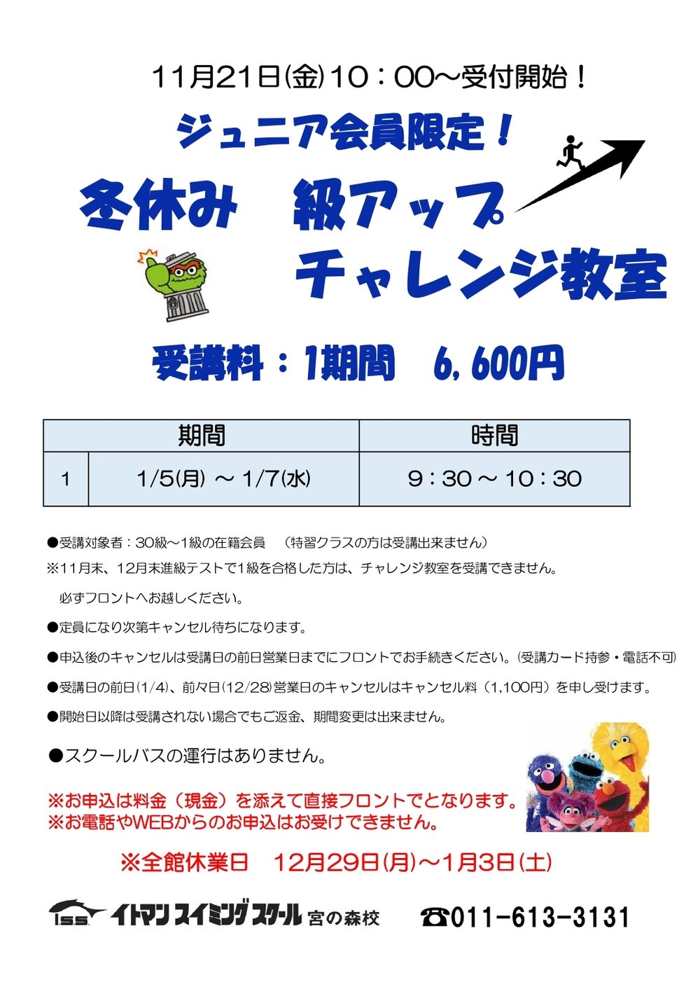 ジュニア会員限定!冬休み級アップチャレンジ教室は11/21(金)から受付開始です(*‘∀‘)