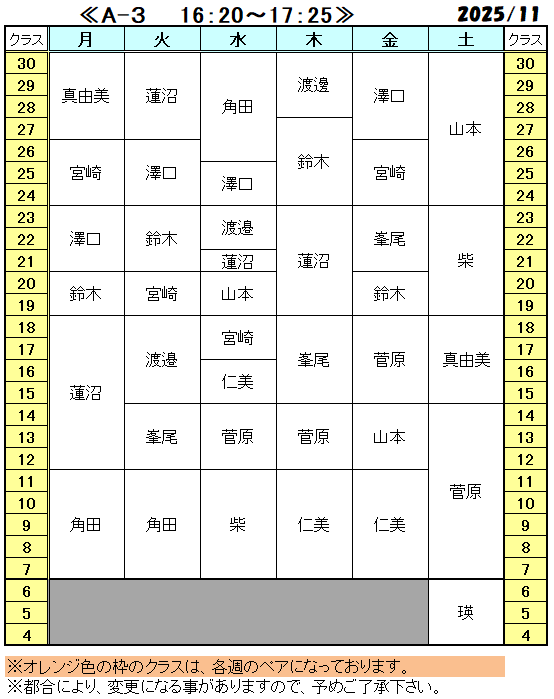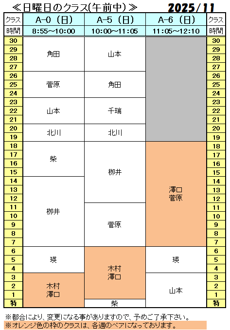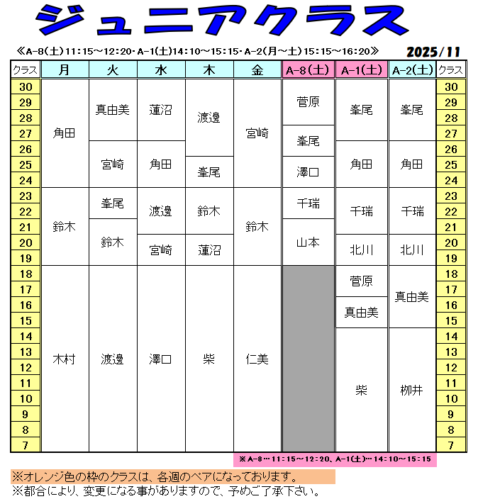 | クラス名 | 時間 | 月 | 火 | 水 | 木 | 金 | 土 |