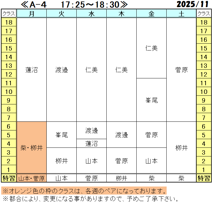 | A-4 | 17:25~18:30 | 18級~特習 | |||||