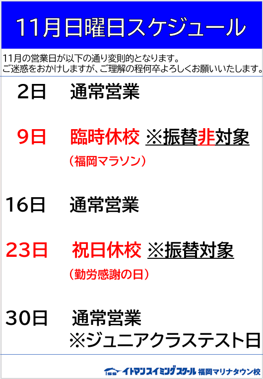 11/9(日)は終日臨時休校日とさせていただきます。