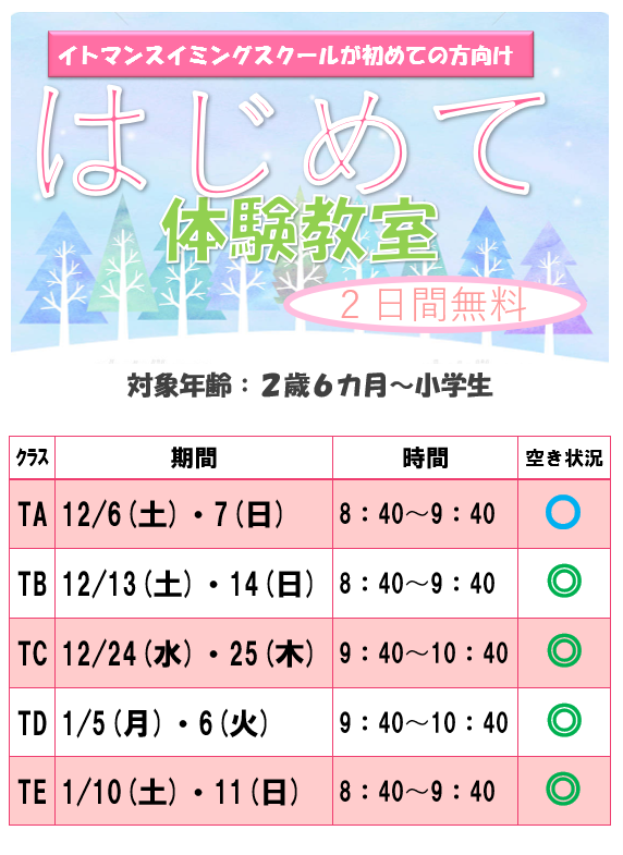 イトマンスイミングの体験がはじめての方対象の2日体験です。