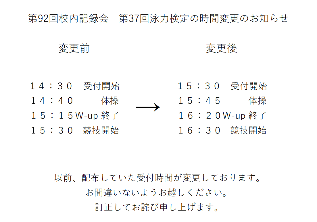 校内記録会、泳力検定会の時間変更のお知らせ