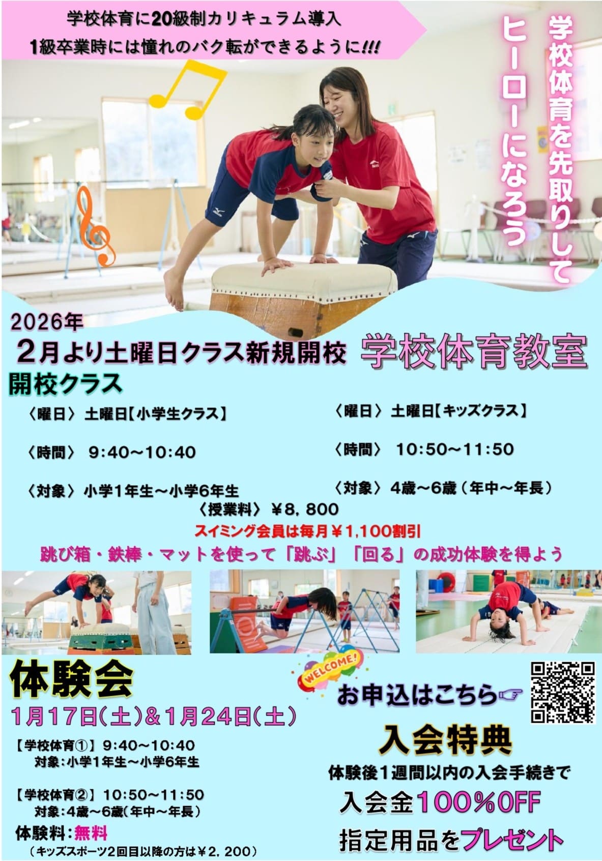 また、ご要望が大変多かった土曜日の午前中に学校体育教室を新規開校いたします。