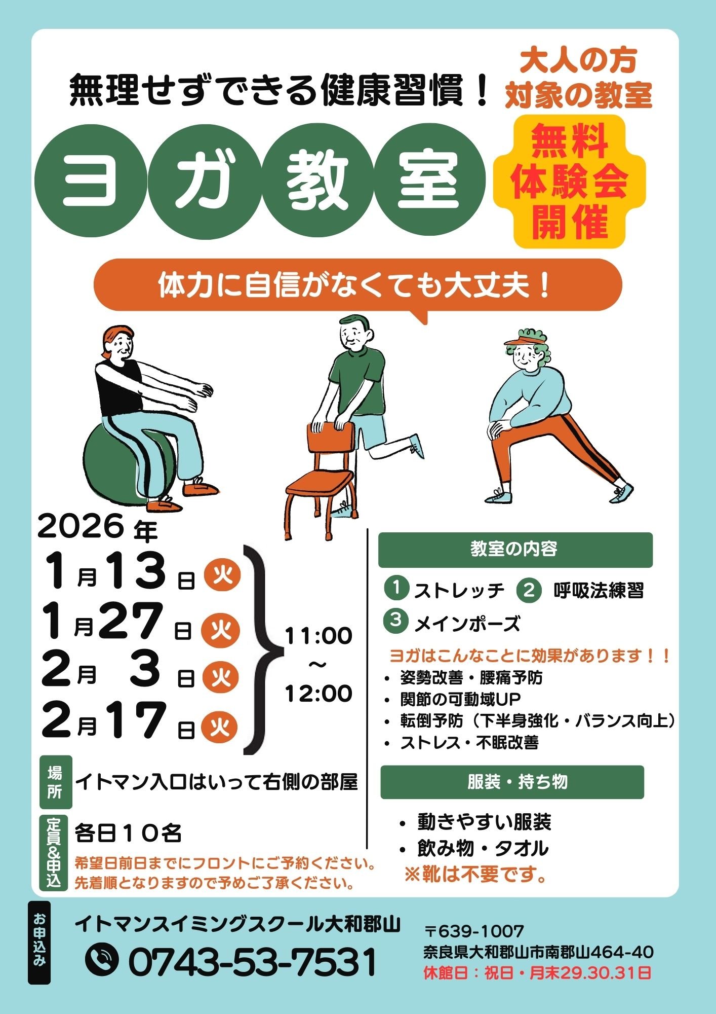 大人の方対象、無料でヨガの体験教室が開催されます!!