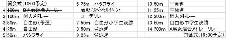 ・ 今大会はイトマンスイミングスクールからの出場者はオープン参加扱いとなります。(メダルの対象外、団体対抗戦の対象外)従って競技順序1,7,13に出場することも出来ません。