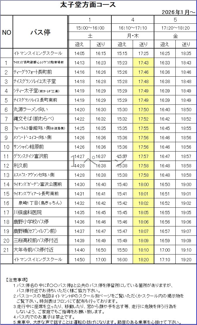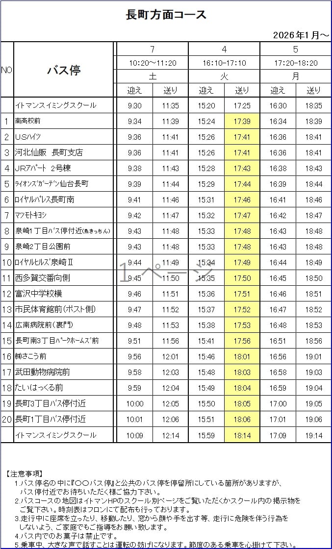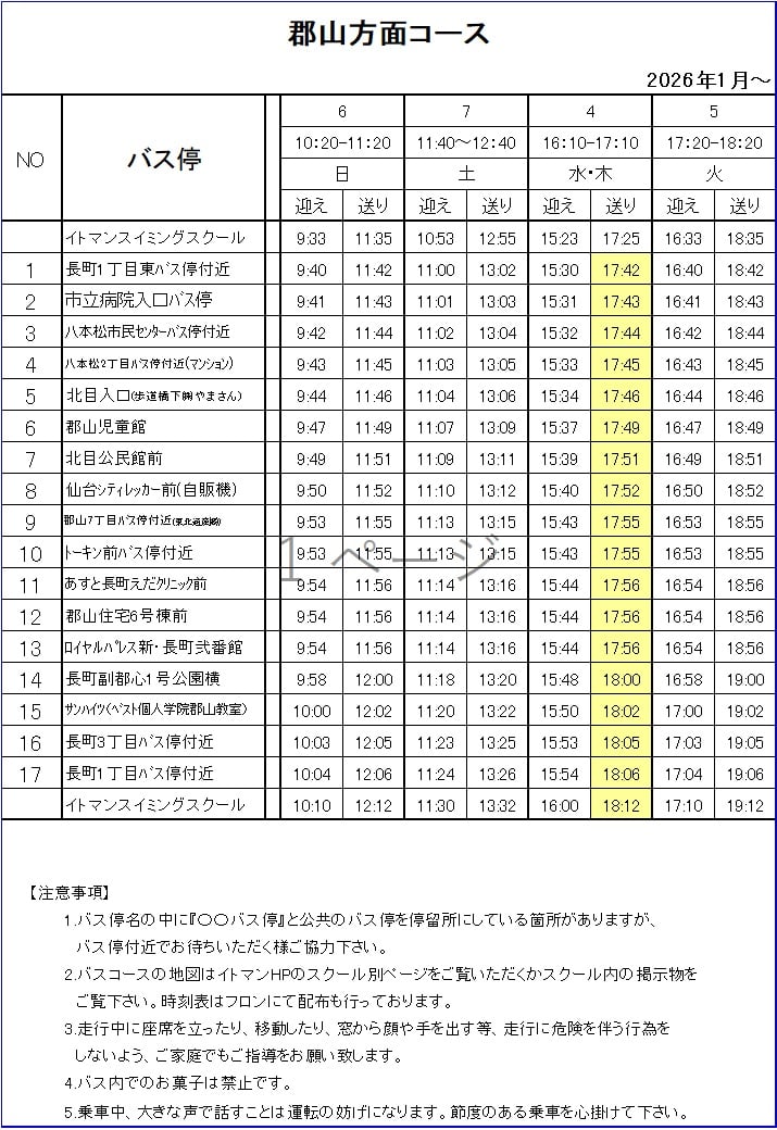2026年1月より、16:10~17:10クラスのバスコース郡山・太子堂・長町の