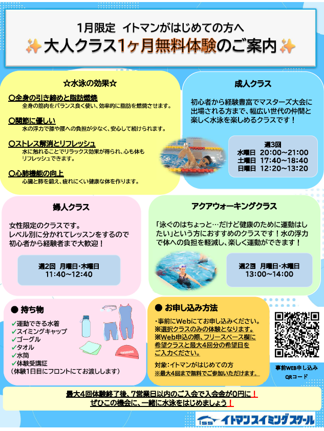 只今、イトマンがはじめての方限定で大人クラス1ヶ月無料体験を行っています!