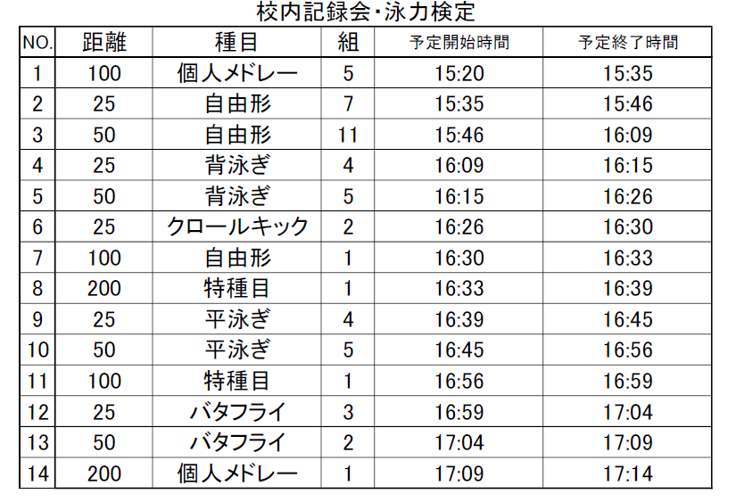 1月25日の校内記録会のタイムテーブルになります。