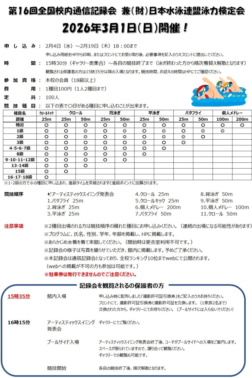 また、日本水泳連盟の泳力検定会も実施します。