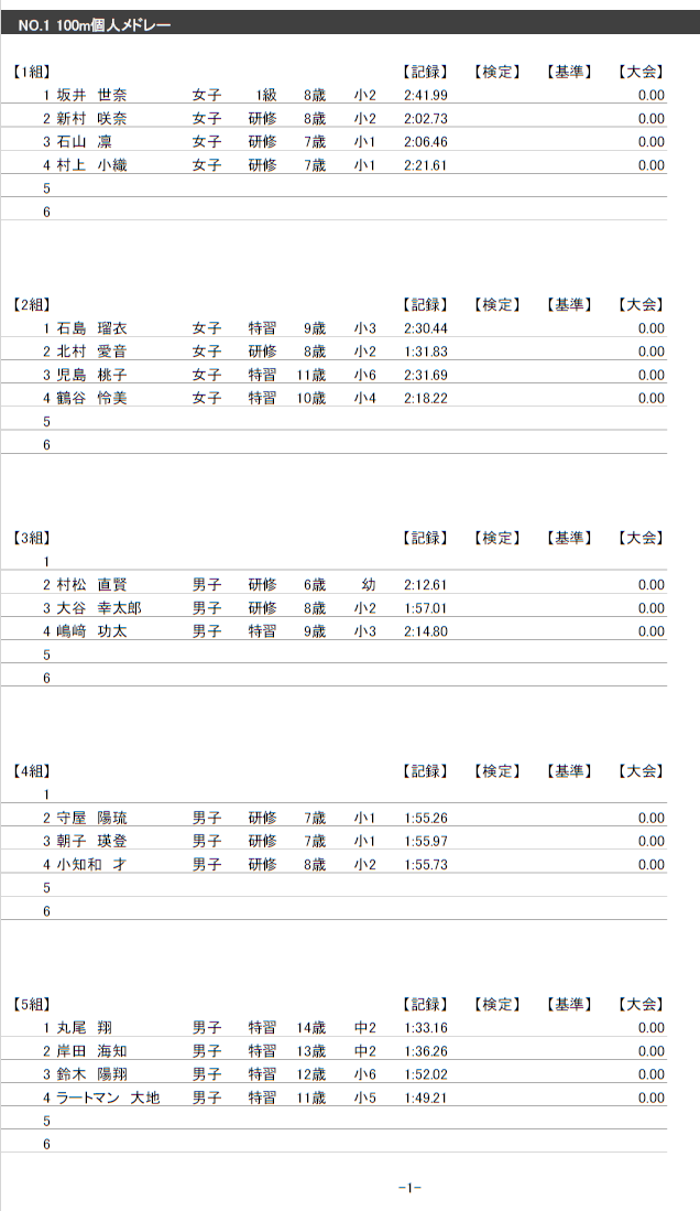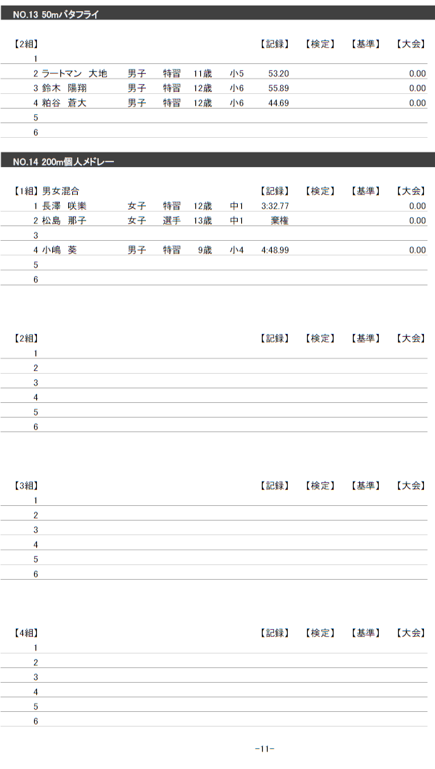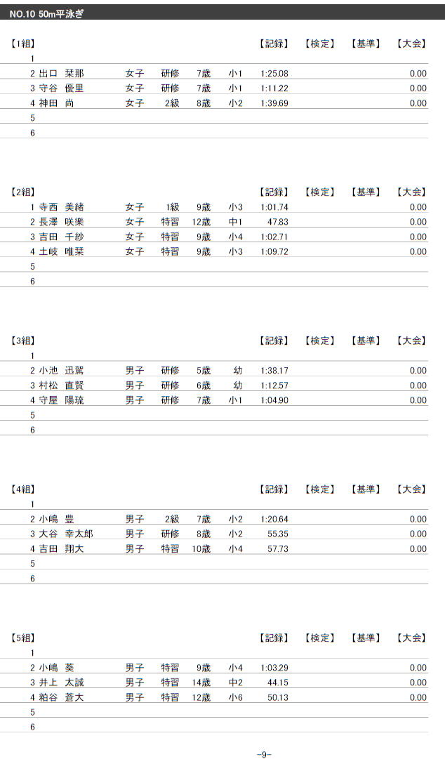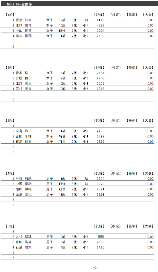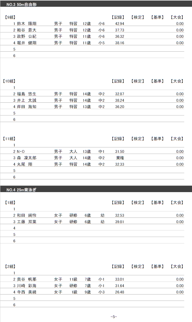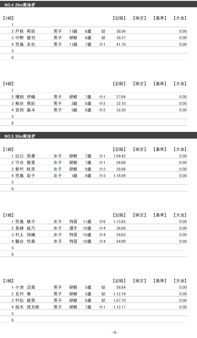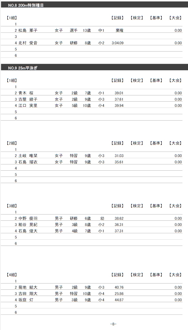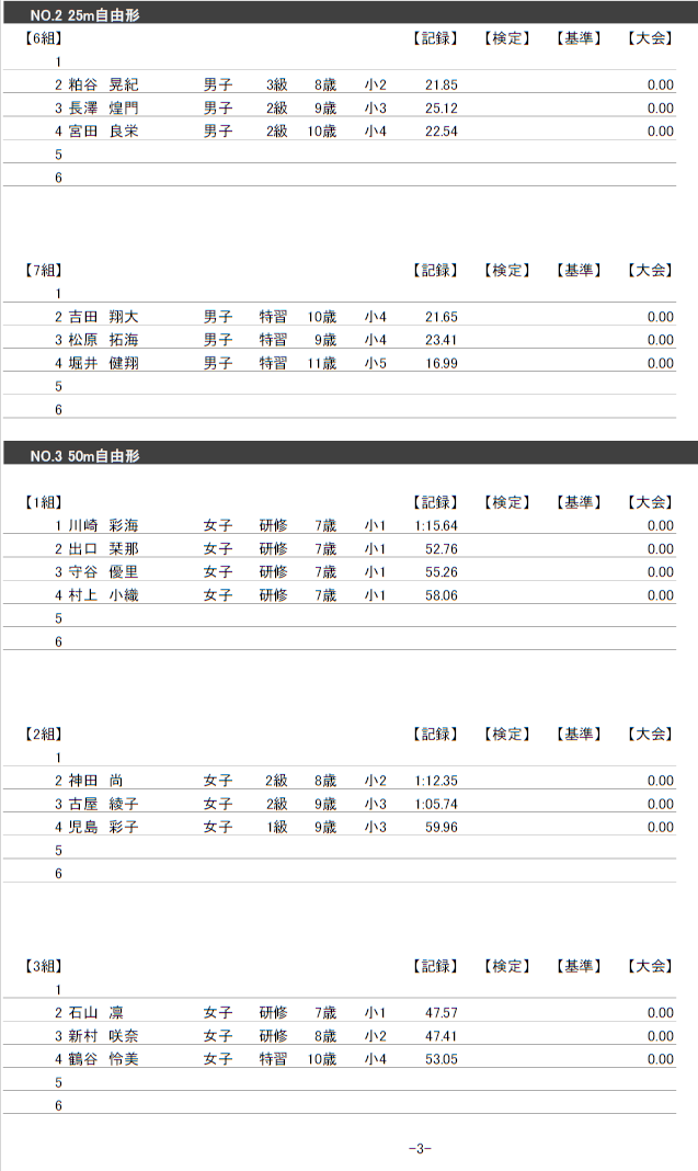 1月25日校内記録会にご参加された会員の皆様へ、結果と泳力検定についてお知らせします。
