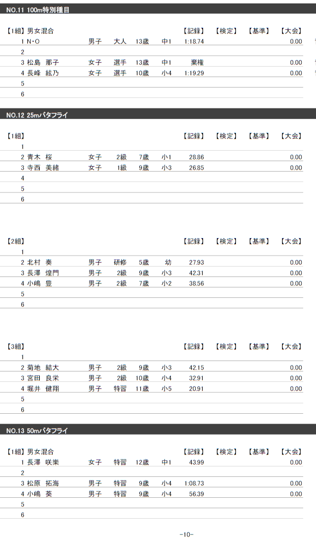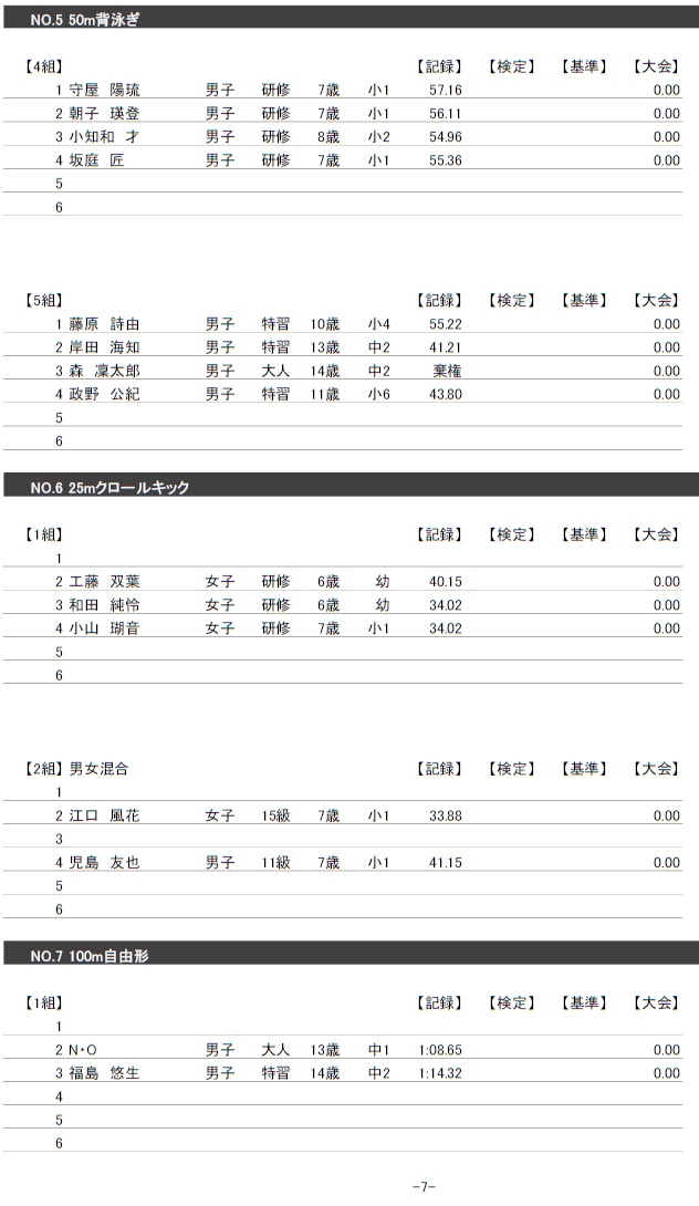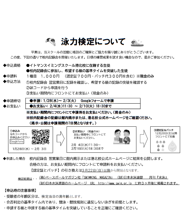また、泳力検定の申請をされる方は、基準タイムの突破の確認と期間内での申請をお願い申し上げます。