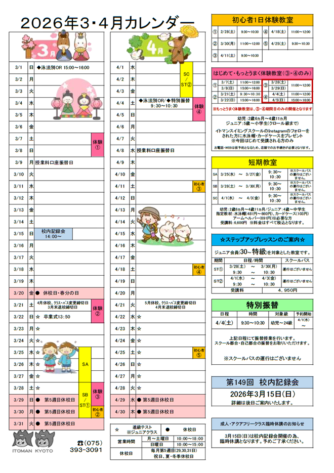 2026年3月・4月カレンダー