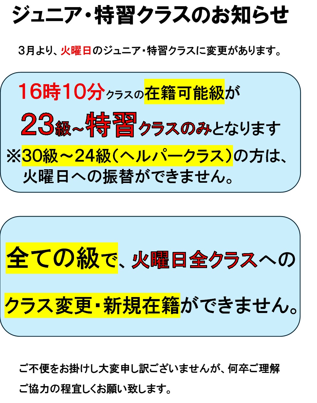 【3月から】ジュニア・特習、火曜日クラス変更点のお知らせ【3/4更新】