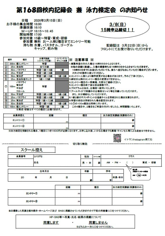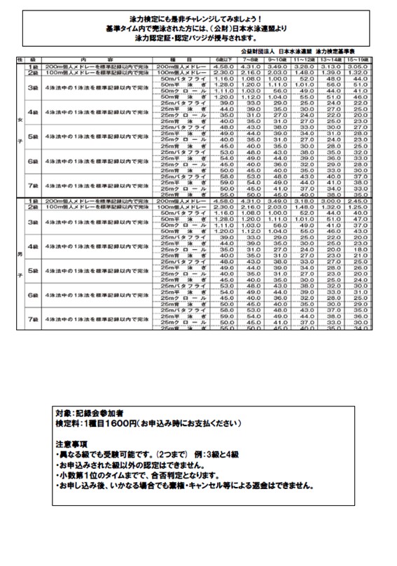 3月15日(日)に校内記録会兼泳力検定会を行います