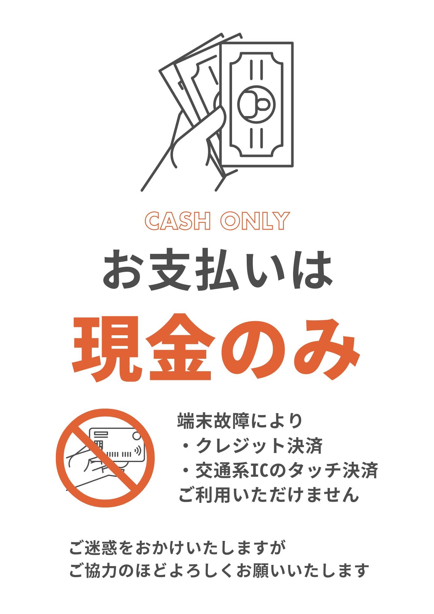 ただいま決済端末の故障により、クレジットカードおよび交通系タッチ決済が