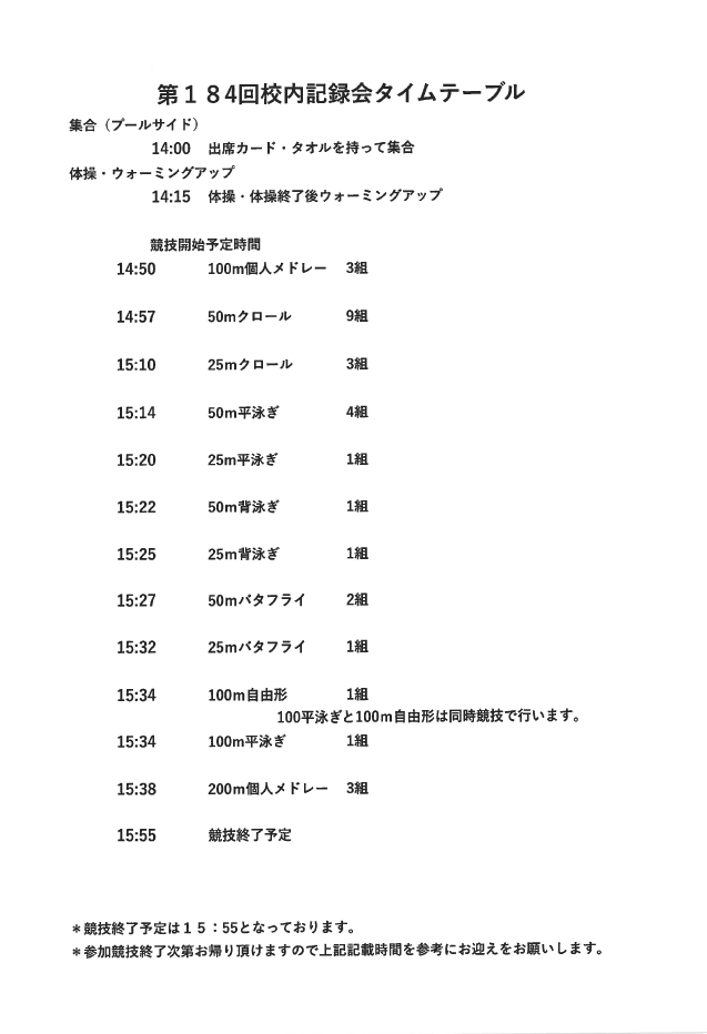 第184回校内記録会タイムテーブルのお知らせ