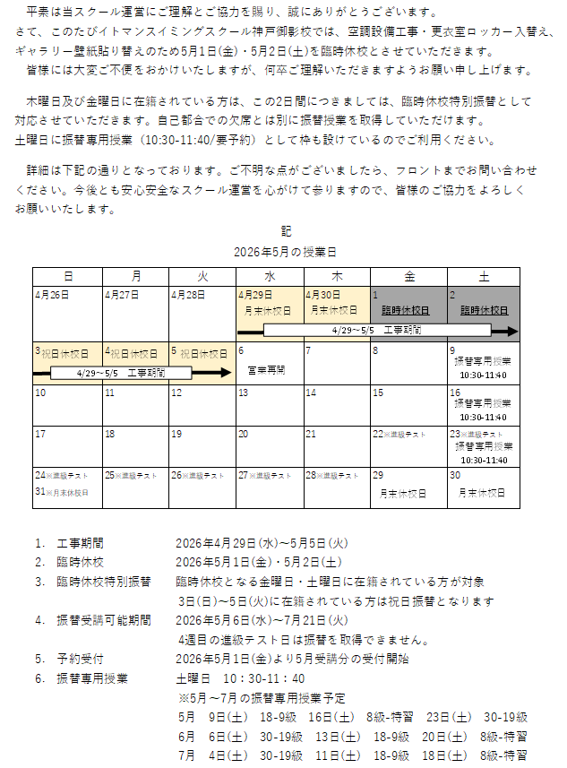 なお、ベビークラス・高学年クラスにおいては誠に勝手ながら臨時休校日の代替え営業は行いませんので、