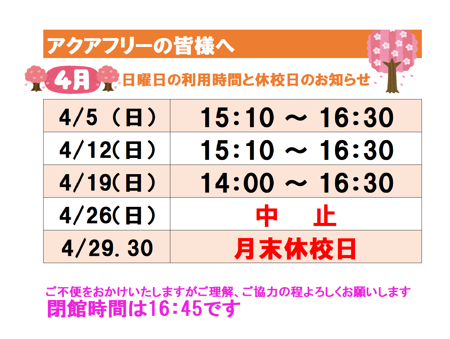 4月のアクアフリー 日曜日の利用時間と休館日のお知らせ