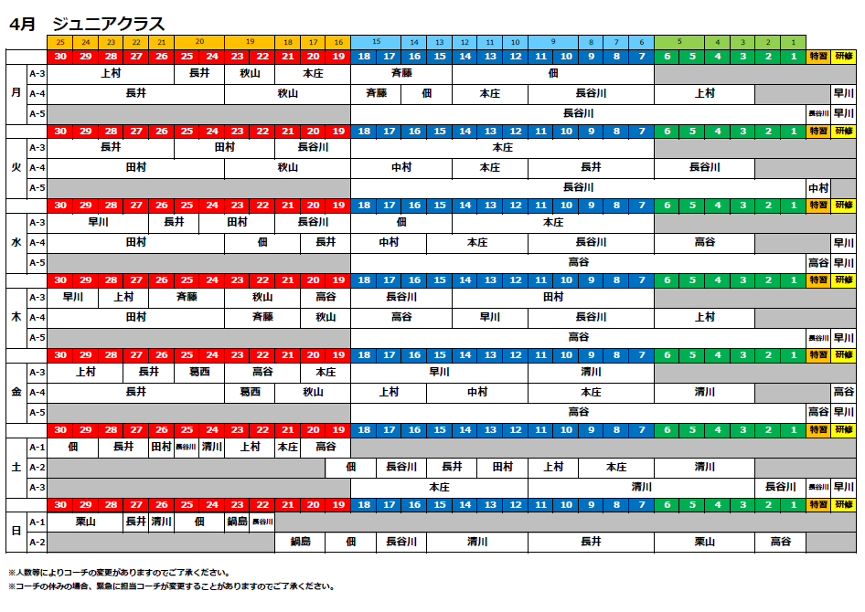4月度ジュニアクラス担当表