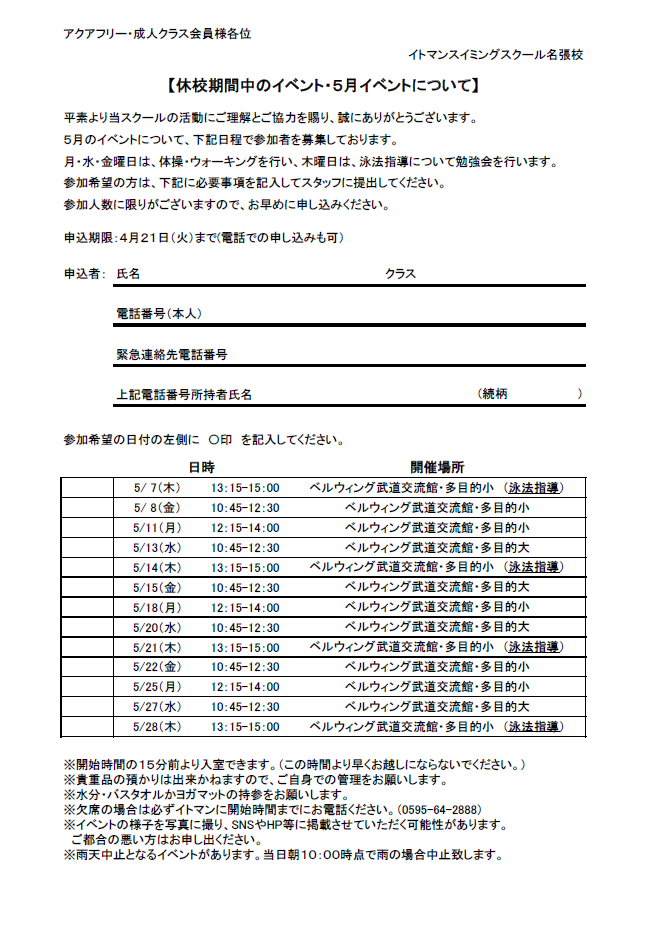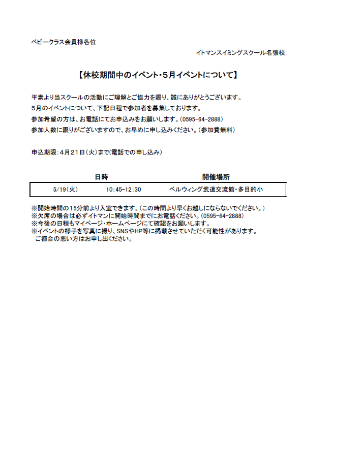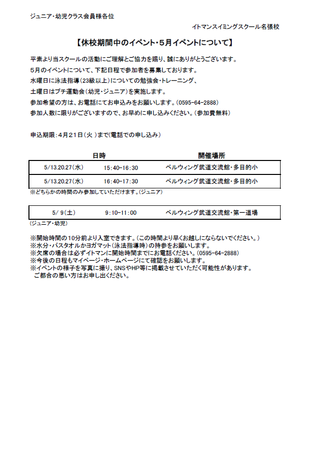 5月度のイベントについてお知らせさせていただきます。