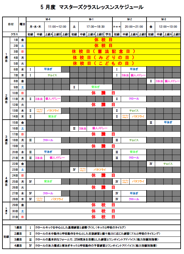 5月度マスターズクラスレッスンスケジュール