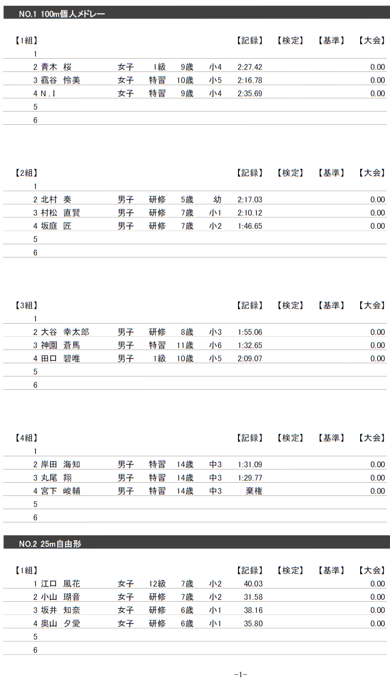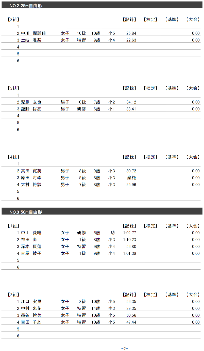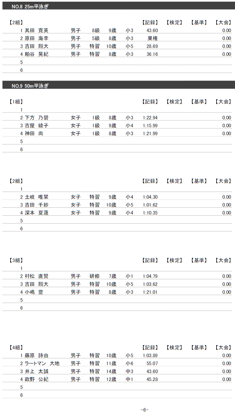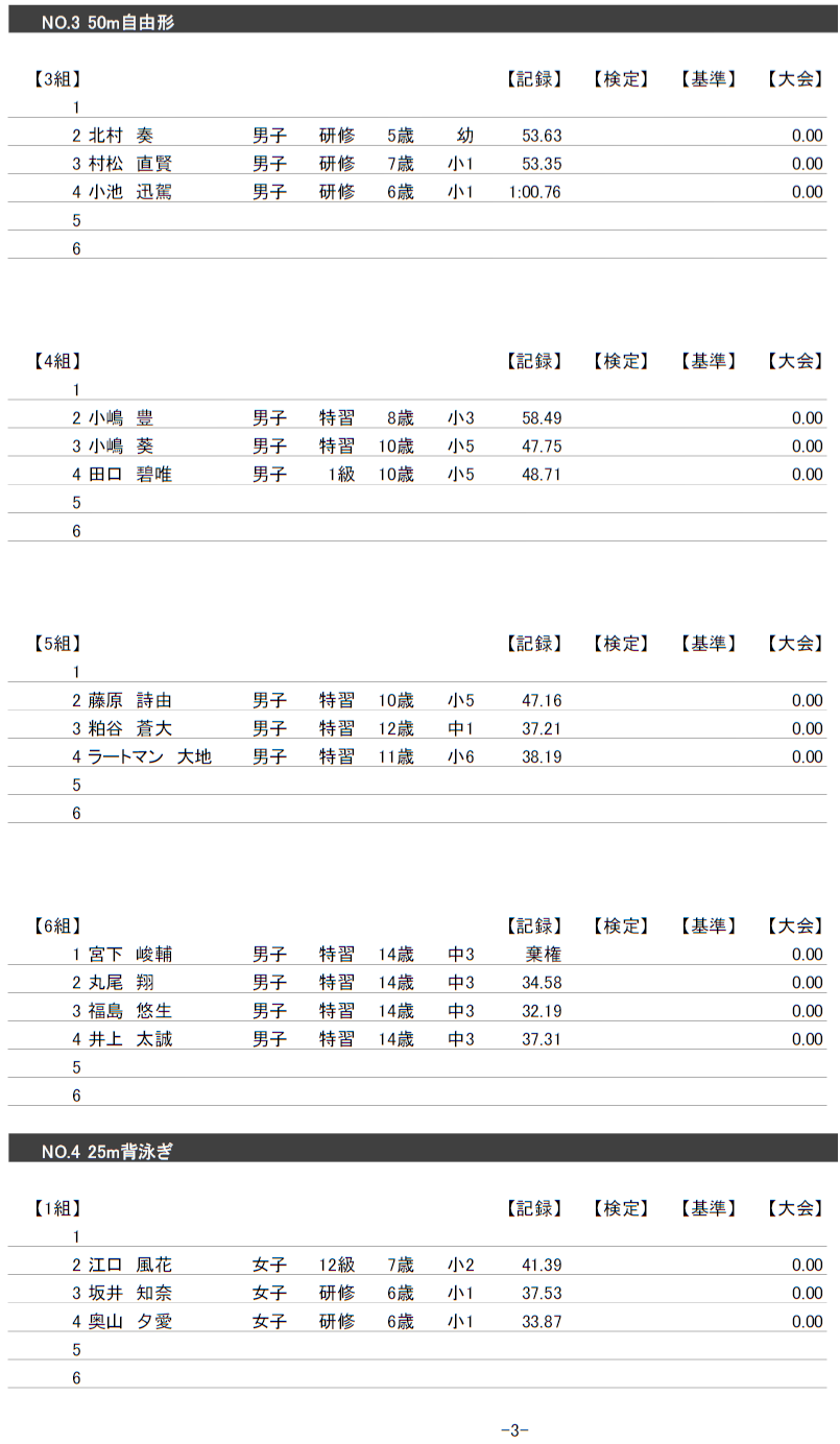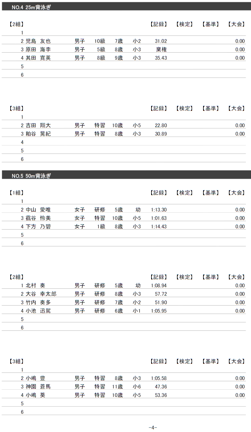 4月26日校内記録会にご参加された会員の皆様へ、結果と泳力検定についてお知らせします。