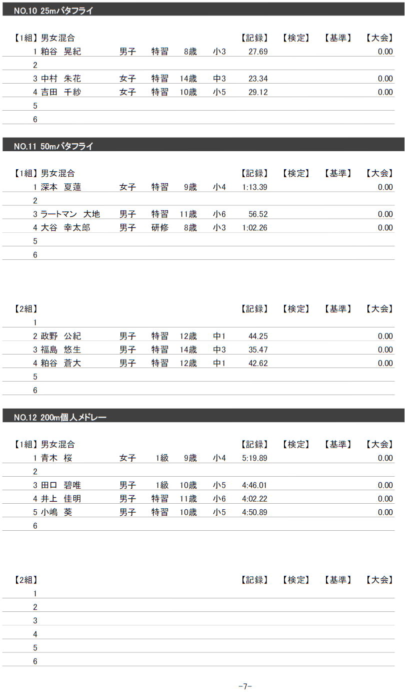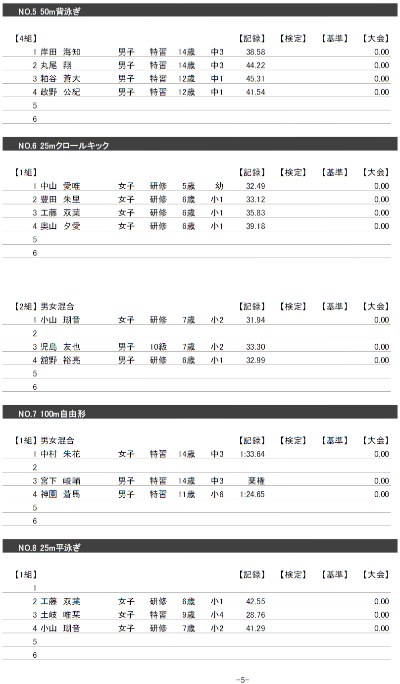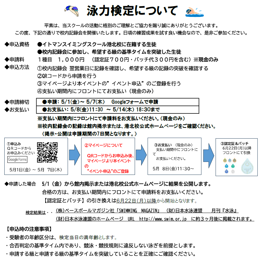 また、泳力検定の申請をされる方は、基準タイムの突破の確認と期間内での申請をお願い申し上げます。