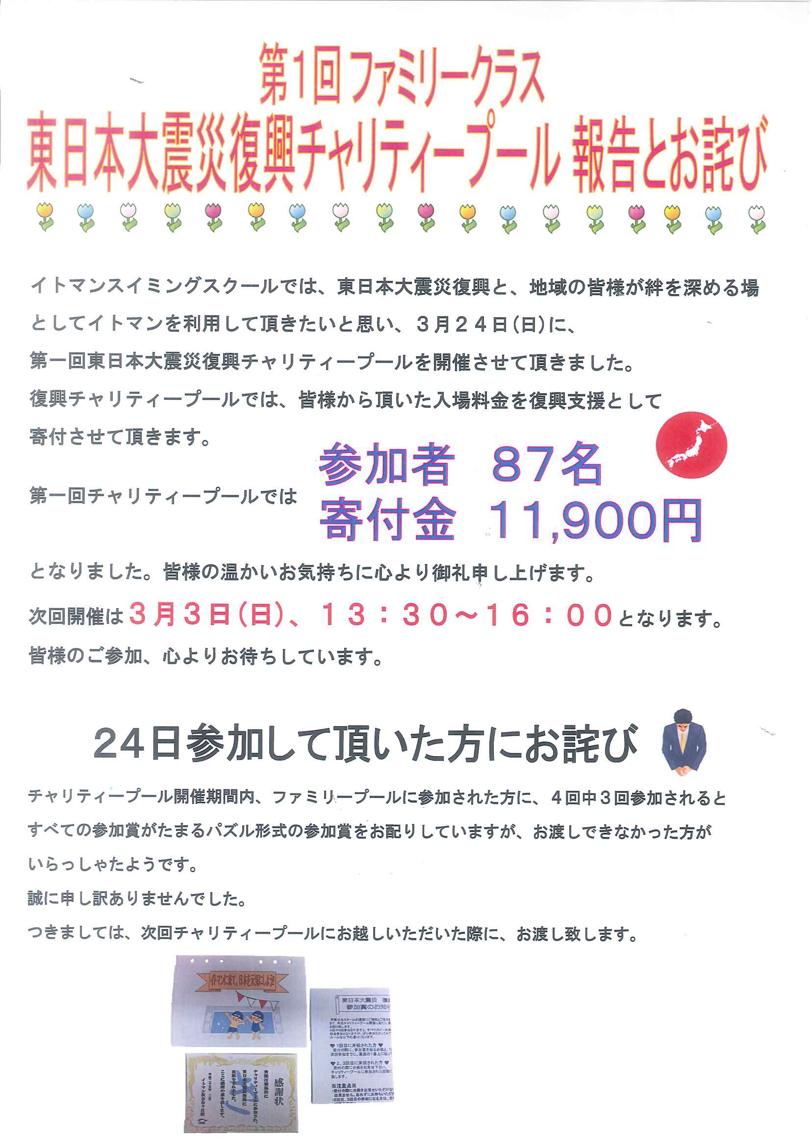 ★第一回ファミリークラス 東日本大震災復興チャリティープール 報告とお詫び★