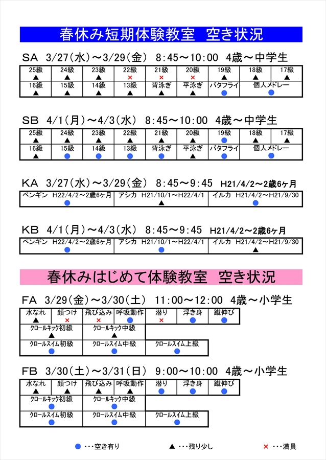 短期・はじめて体験空き状況