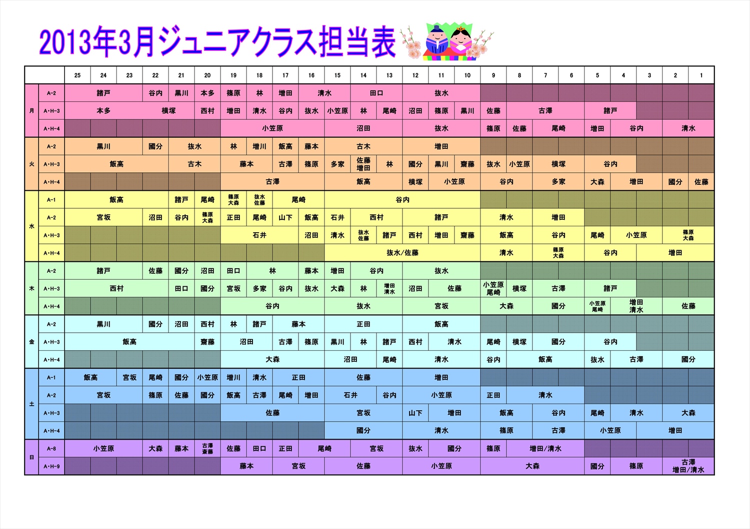 3月度 ジュニアクラス担当表