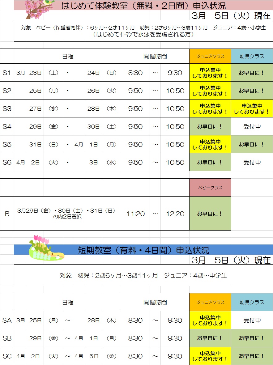 春休み教室の申込状況(3月5日現在)をアップさせていただきます。