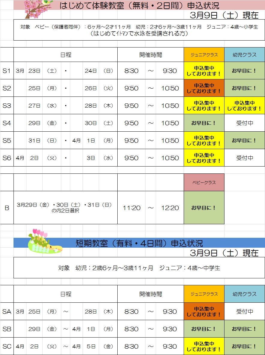 春休み教室の申込状況(3月9日現在)をアップさせていただきます。