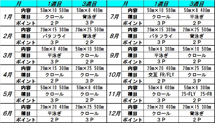 また、強化種目の変更に合わせて、完泳種目とポイント数も変更させて頂きます。