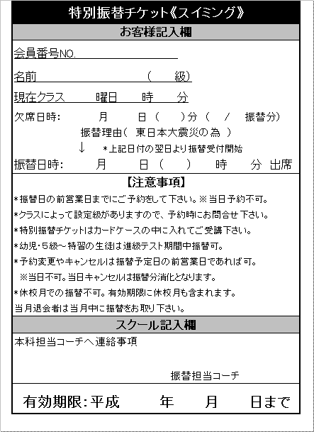 なお、 ご連絡なしに欠席された場合はその時点で振替の権利が消失いたします