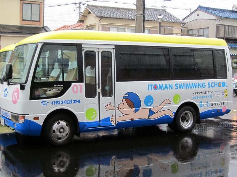 ↑ バスの後ろにある「競泳日本代表選手31名 6人に1人はイトマン選手!」